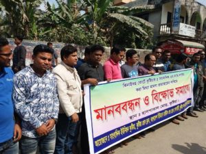 সংবাদ বিজ্ঞপ্তি ॥ কুষ্টিয়া থেকে প্রকাশিত দৈনিক শিকলের ৫ সাংবাদিক এর নামে ঝিনাইদহ কোর্টে উদ্দেশ্য প্রনোদিত মামলা করায় তীব্র নিন্দা, প্রতিবাদ ও অবিলম্বে মামলা প্রত্যাহারের দাবিতে মানববন্ধন ও বিক্ষোভ সমাবেশ করেছে, সাংবাদিক ইউনিয়ন কুষ্টিয়া, কুষ্টিয়া প্রেসকাব, বাংলাদেশ হিউম্যান রাইটস এন্ড প্রেস সোসাইটি কুষ্টিয়া ও কুষ্টিয়া সদর উপজেলা প্রেসকাব। গতকাল সকাল ১১টায় কুষ্টিয়া সদর হাসপাতাল মোড়ে কুষ্টিয়া থেকে প্রকাশিত দৈনিক সময়ের দিগন্ত পত্রিকার সম্পাদক ও কুষ্টিয়া সদর উপজেলা প্রেসকাবের যুগ্ম আহবায়ক, বাংলাদেশ হিউম্যান রাইটস এন্ড প্রেস সোসাইটির কুষ্টিয়া শাখার সাধারন সম্পাদক নাহিদ হাসান তিতাসের সঞ্চালনায় বক্তব্য রাখেন, কুষ্টিয়া প্রেসকাব ও সাংবাদিক ইউনিয়ন কুষ্টিয়ার সভাপতি ও দৈনিক আরশীনগর পত্রিকার সম্পাদক রাশেদুল ইসলাম বিপ্লব। তিনি বলেন, ঝিনাইদহের সরকার দলীয় সাংসদ নবী নেওয়াজ এর বিরুদ্ধে কুষ্টিয়া থেকে প্রকাশিত দৈনিক শিকলসহ দেশের সুনামধন্য টেলিভিশন ও প্রিন্ট মিডিয়ায় ধারা বাহিক ভাবে অনিয়ম ও দূর্নীতির খবর প্রকাশিত হলে তিনি সাংবাদিকদের উপর ক্ষিপ্ত হয়ে ঝিনাইদহ কোর্টে মামলা করেন, অবিলম্বে এই মিথ্যা মামলা প্রত্যাহারের দাবি জানিয়ে সাংসদ নবী নেওয়াজ এর ১০০ কোটি টাকার সম্পদ এর উৎস কি ? তা খুজে বের করতে দূর্নীতি দমন কমিশনকে অনুরোধ জানিয়েছেন। অবিলম্বে সাংবাদিকদের বিরুদ্ধে করা মামলা প্রত্যাহার না করা হলে কঠোর কর্মসূচী দেওয়া হবে। এসময় আরো বক্তব্য রাখেন, কুষ্টিয়া প্রেসকাবের যুগ্ম সাধারন সম্পাদক ও আরটিভির জেলা প্রতিনিধি শেখ হাসান বেলাল, যুগ্ম সম্পাদক, দৈনিক সত্য খবর পত্রিকার সম্পাদক ও এশিয়ান টিভির জেলা প্রতিনিধি হাসিবুর রহমান রিজু, কুষ্টিয়া প্রেসকাব এর দপ্তর সম্পাদক ইন্ডিপেনডেন্ট টিভি’র জেলা প্রতিনিধি মিলন উল্লাহ, কুষ্টিয়া সদর উপজেলা প্রেসকাবের আহবায়ক, কুষ্টিয়া রিপোর্টার্স কাবের সভাপতি সাংবাদিক ইউনিয়ন কুষ্টিয়ার সাংগঠনিক সম্পাদক ও দৈনিক নওরোজ এর জেলা প্রতিনিধি মাহমুদ হাসান, কুষ্টিয়া প্রেসকাবের সাবেক সভাপতি মুকুল খসরু, কুষ্টিয়া রিপোর্টার্স কাবের যুগ্মসম্পাদক ইমরান হাসান পাপ্পু, দৈনিক সত্য খবরের স্টাফ রিপোর্টার শাহরিয়ার ইমন, আরাফাত হোসেন, দৈনিক সময়ের কাগজ পত্রিকার ষ্টাফ রিপোর্টার আব্দুর সামাদ, কুষ্টিয়া নিউজ এর সম্পাদক ও দৈনিক কুষ্টিয়া পত্রিকার বার্তা সম্পাদক মাহাতাব উদ্দিন লালন, কুষ্টিয়ার কন্ঠ অনলাইনের সম্পাদক নাব্বির আল নাফিজ, দৈনিক জনবানীর জেলা প্রতিনিধি সুমন মাহমুদ, দৈনিক যোগাযোগ প্রতিদিন এর জেলা প্রতিনিধি তামিম আদনান,মারুফ রহমান, গ্রামের কাগজের জেলা প্রতিনিধি অর্কসহ কুষ্টিয়ার সর্