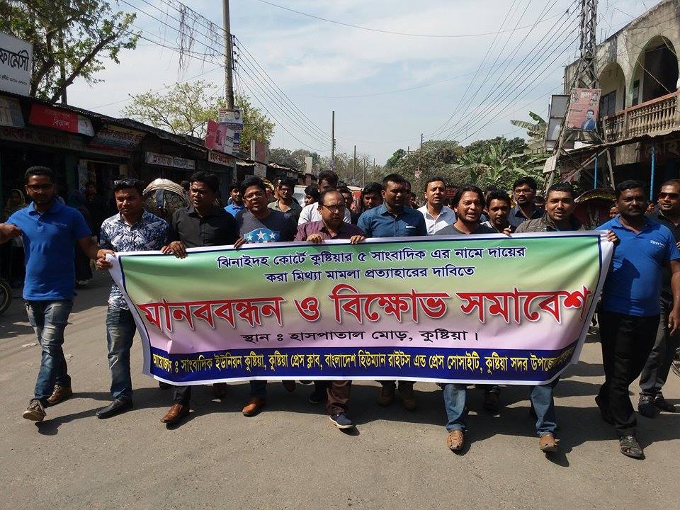 সংবাদ বিজ্ঞপ্তি ॥ কুষ্টিয়া থেকে প্রকাশিত দৈনিক শিকলের ৫ সাংবাদিক এর নামে ঝিনাইদহ কোর্টে উদ্দেশ্য প্রনোদিত মামলা করায় তীব্র নিন্দা, প্রতিবাদ ও অবিলম্বে মামলা প্রত্যাহারের দাবিতে মানববন্ধন ও বিক্ষোভ সমাবেশ করেছে, সাংবাদিক ইউনিয়ন কুষ্টিয়া, কুষ্টিয়া প্রেসকাব, বাংলাদেশ হিউম্যান রাইটস এন্ড প্রেস সোসাইটি কুষ্টিয়া ও কুষ্টিয়া সদর উপজেলা প্রেসকাব। গতকাল সকাল ১১টায় কুষ্টিয়া সদর হাসপাতাল মোড়ে কুষ্টিয়া থেকে প্রকাশিত দৈনিক সময়ের দিগন্ত পত্রিকার সম্পাদক ও কুষ্টিয়া সদর উপজেলা প্রেসকাবের যুগ্ম আহবায়ক, বাংলাদেশ হিউম্যান রাইটস এন্ড প্রেস সোসাইটির কুষ্টিয়া শাখার সাধারন সম্পাদক নাহিদ হাসান তিতাসের সঞ্চালনায় বক্তব্য রাখেন, কুষ্টিয়া প্রেসকাব ও সাংবাদিক ইউনিয়ন কুষ্টিয়ার সভাপতি ও দৈনিক আরশীনগর পত্রিকার সম্পাদক রাশেদুল ইসলাম বিপ্লব। তিনি বলেন, ঝিনাইদহের সরকার দলীয় সাংসদ নবী নেওয়াজ এর বিরুদ্ধে কুষ্টিয়া থেকে প্রকাশিত দৈনিক শিকলসহ দেশের সুনামধন্য টেলিভিশন ও প্রিন্ট মিডিয়ায় ধারা বাহিক ভাবে অনিয়ম ও দূর্নীতির খবর প্রকাশিত হলে তিনি সাংবাদিকদের উপর ক্ষিপ্ত হয়ে ঝিনাইদহ কোর্টে মামলা করেন, অবিলম্বে এই মিথ্যা মামলা প্রত্যাহারের দাবি জানিয়ে সাংসদ নবী নেওয়াজ এর ১০০ কোটি টাকার সম্পদ এর উৎস কি ? তা খুজে বের করতে দূর্নীতি দমন কমিশনকে অনুরোধ জানিয়েছেন। অবিলম্বে সাংবাদিকদের বিরুদ্ধে করা মামলা প্রত্যাহার না করা হলে কঠোর কর্মসূচী দেওয়া হবে। এসময় আরো বক্তব্য রাখেন, কুষ্টিয়া প্রেসকাবের যুগ্ম সাধারন সম্পাদক ও আরটিভির জেলা প্রতিনিধি শেখ হাসান বেলাল, যুগ্ম সম্পাদক, দৈনিক সত্য খবর পত্রিকার সম্পাদক ও এশিয়ান টিভির জেলা প্রতিনিধি হাসিবুর রহমান রিজু, কুষ্টিয়া প্রেসকাব এর দপ্তর সম্পাদক ইন্ডিপেনডেন্ট টিভি’র জেলা প্রতিনিধি মিলন উল্লাহ, কুষ্টিয়া সদর উপজেলা প্রেসকাবের আহবায়ক, কুষ্টিয়া রিপোর্টার্স কাবের সভাপতি সাংবাদিক ইউনিয়ন কুষ্টিয়ার সাংগঠনিক সম্পাদক ও দৈনিক নওরোজ এর জেলা প্রতিনিধি মাহমুদ হাসান, কুষ্টিয়া প্রেসকাবের সাবেক সভাপতি মুকুল খসরু, কুষ্টিয়া রিপোর্টার্স কাবের যুগ্মসম্পাদক ইমরান হাসান পাপ্পু, দৈনিক সত্য খবরের স্টাফ রিপোর্টার শাহরিয়ার ইমন, আরাফাত হোসেন, দৈনিক সময়ের কাগজ পত্রিকার ষ্টাফ রিপোর্টার আব্দুর সামাদ, কুষ্টিয়া নিউজ এর সম্পাদক ও দৈনিক কুষ্টিয়া পত্রিকার বার্তা সম্পাদক মাহাতাব উদ্দিন লালন, কুষ্টিয়ার কন্ঠ অনলাইনের সম্পাদক নাব্বির আল নাফিজ, দৈনিক জনবানীর জেলা প্রতিনিধি সুমন মাহমুদ, দৈনিক যোগাযোগ প্রতিদিন এর জেলা প্রতিনিধি তামিম আদনান,মারুফ রহমান, গ্রামের কাগজের জেলা প্রতিনিধি অর্কসহ কুষ্টিয়ার সর্