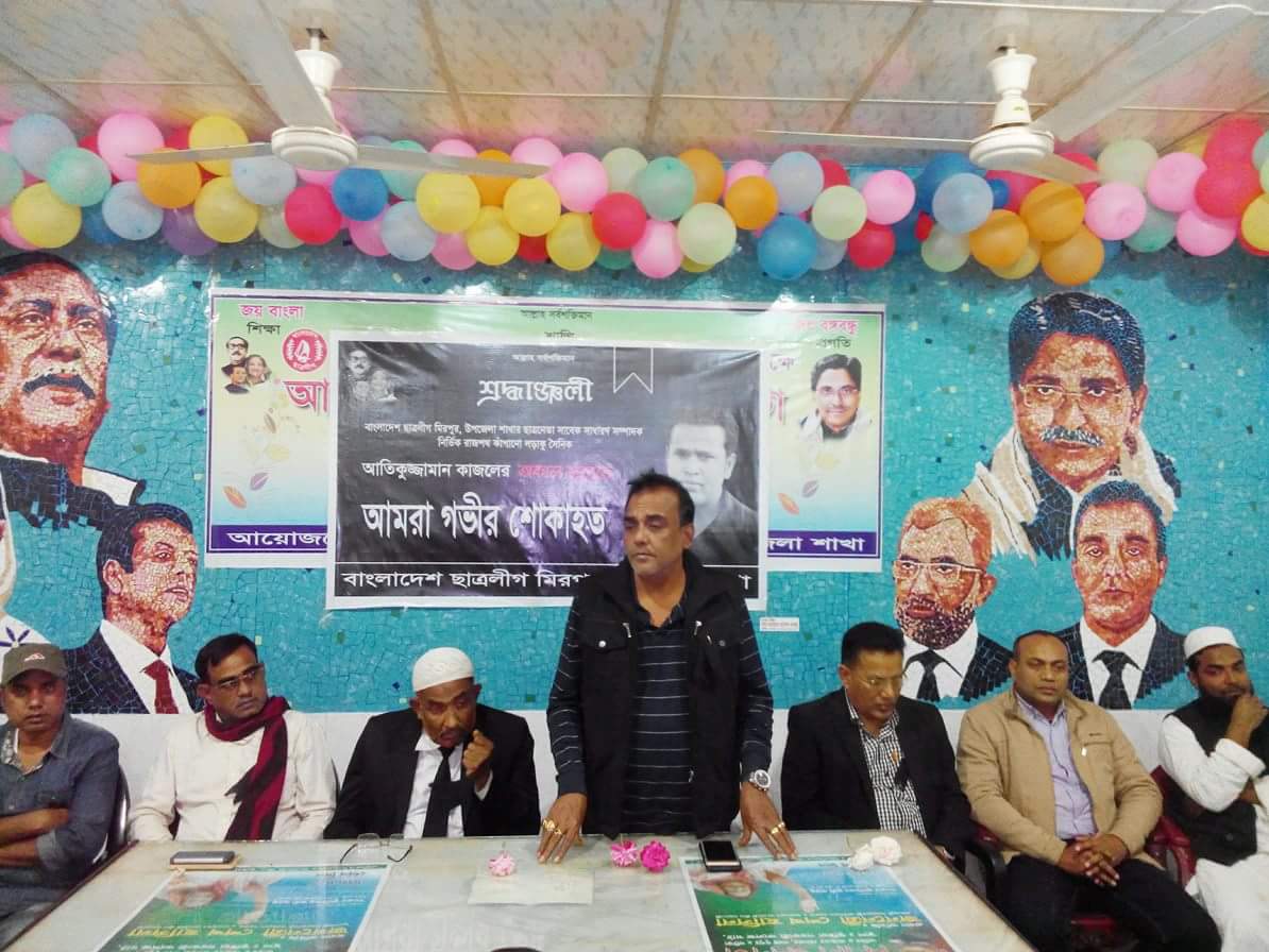 হাফিজুল ইসলাম : মিরপুর উপজেলা ছাত্রলীগের সাবেক সাধারণ সম্পাদক আতিকুজ্জামান কাজলের অকাল মৃত্যুতে উপজেলা আওয়ামীলীগ ও অঙ্গসহযোগী সংগঠন এক স্মরণ সভা ও দোয়া মাহফিলের আয়োজন করে। এছাড়াও গতকাল সকাল থেকে দলীয় কার্যালয়ে জাতীয় পতাকা ও কালো পতাকা উত্তোলন করা হয়। বৃহস্পতিবার বিকেল ৪ টায় উপজেলা আওয়ামীলীগের কার্যালয়ে উপজেলা আওয়ামীলীগের সভাপতি আলহাজ্ব এ্যাডভোকেট আব্দুল হালিমের সভাপতিত্বে প্রধান অতিথি হিসাবে উপস্থিত ছিলেন, উপজেলা আওয়ামীগীরে সাধারণ সম্পাদক উপজেলা পরিষদ চেয়ারম্যান কামারুল আরেফিন। জেলা পরিষদের নব-নির্বাচিত সদস্য ও শিক্ষা ও মানবসম্পদ বিষয়ক সম্পাদক মহাম্মদ আলী জোয়ার্দ্দারের পরিচালনায় বিশেষ অতিথি হিসাবে উপস্থিত ছিলেন যুগ্ম-সাধারণ সম্পাদক আনোয়ারুল হক মালিথা, আতাহার আলী, কাজলের বড় ভাই আমানউল্লাহ খোকন, পৌর আওয়ামীলীগের সাধারণ সম্পাদক ফেরদৌস ওয়াহেদ জোয়ার্দ্দার, দক্ষিণ আফ্রিকা প্রবাসী শেখ আরিফুর রহমান। এছাড়া উপস্থিত ছিলেন উপজেলা আওয়ামীলীগের দপ্তর সম্পাদক রাশেদুজ্জামান ছন্দ, প্রচার সম্পাদক বিএম জুবায়ের রিগান, শ্রম বিষয়ক সম্পাদক আমিরুল ইসলাম, চিথলিয়া ইউনিয়ন পরিষদের চেয়ারম্যান গিয়াস উদ্দিন, উপজেলা যুবলীগের সাধারণ সম্পাদক আব্দুল হালিম বিশ্বাস, প্রচার সম্পাদক আতাউর রহমান খান মহন, উপজেলা আওয়ামীলীগের সদস্য শুকুর আলী, ফুলবাড়ীয়া ইউনিয়ন আওয়ামীলীগের সাধারণ সম্পাদক নুরুল ইসলাম, সাবেক উপজেলা ছাত্রলীগের সভাপতি সাইফুর রহমান নাজিম, উপজেলা শ্রমিক লীগের সাংগঠনিক সম্পাদক আশরাফুল আলম হিরা, উপজেলা যুবলীগের সাংগঠনিক সম্পাদক মশিউর রহমান মোরর্শেদ, পৌরসভার কাউন্সিলর খোয়াব আলী, পৌর যুবলীগের আহবায়ক হাসানুর রহমান খান তাপস, উপজেলা ছাত্রলীগের যুগ্ম-আহবায়ক ডি এস সাদ্দাম, শাহিনুল ইসলাম প্রমুখ। বক্তারা মরহুম আতিকুজ্জামান কাজলের জীবনী স্মৃতি চারণ ও পরে মিরপুর পৌর মসজিদের পেশ ঈমাম মুফতি মাওলানা মোঃ ফারুকী বিশেষ দোয়া ও মোনাজাত পরিচালনা করেন।