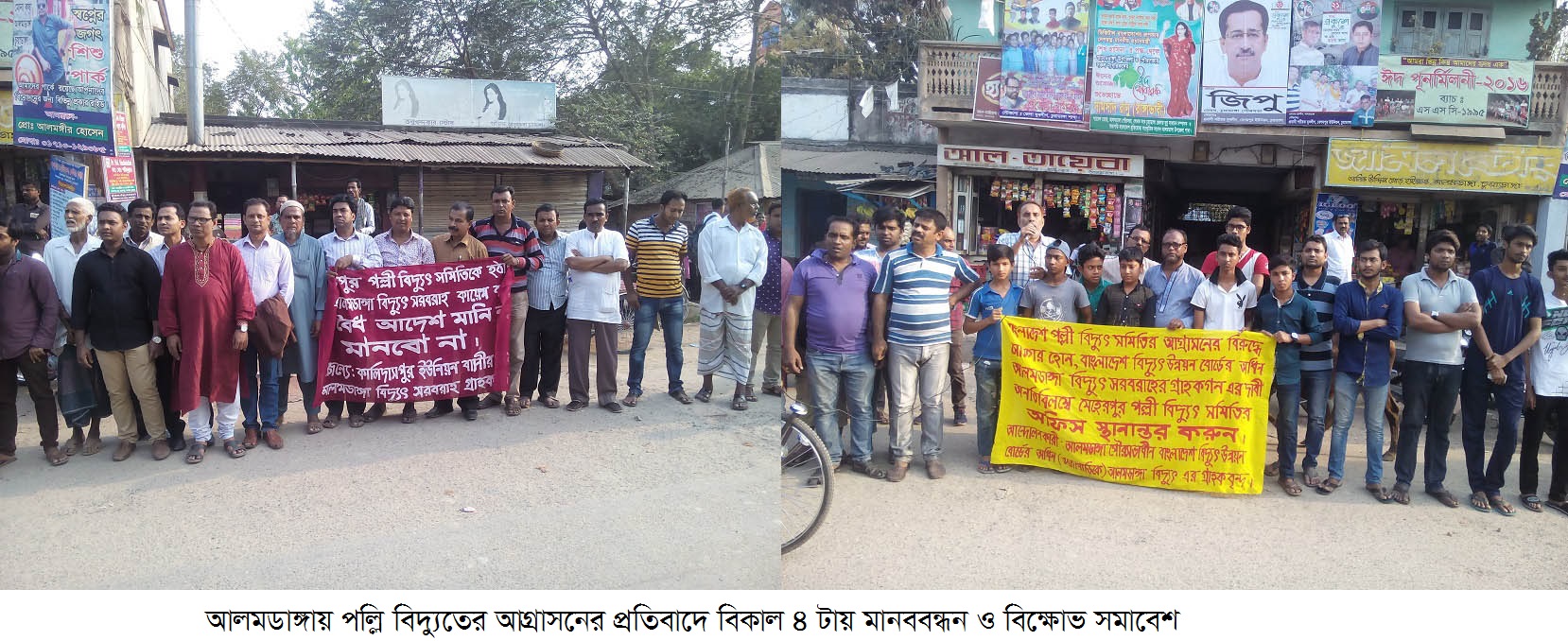 জামিরুল ইসলাম, চুয়াডাঙ্গা প্রতিনিধি: আলমডাঙ্গা প্রধান সড়কে পল্লি বিদ্যুতের আগ্রাসনের প্রতিবাদে বিকাল ৪ টায় মানববন্ধন ও বিক্ষোভ সমাবেশ অনুষ্ঠিত হয়েছে। সমাবেশে বক্তব্য রাখেন আলমডাঙ্গার কালিদাসপুর ইউনিয়নের চেয়ারম্যান নুরুল ইসলাম, মিল চাতাল মালিক সমিতির সভাপতি আহসান উল্লাহ, মীর ইসমাইল হোসেন, উপজেলা কৃষকলীগের সভাপতি আজজুল হক, কলেজিয়েট স্কুলের উপাধ্যক্ষ শামীম রেজা, মাসুদ রানা তুহিন, জয়নাল আবেদীন, আলহাজ¦ আমীর আলী মন্ডল, ফজলে এলাহী, আজিজুর রহমান পিন্টু, বজলুর রহমান, তরিকুল ইসলাম, আশরাফুল আলম, মসলেম আলী, আহসান হাবীব, ফরজ আলী, নুর ইসলাম, সাইদ আলী প্রমুখ। এসময় বক্তরা পল্লি বিদ্যুতের কর্মকর্তাদের হুশিয়ার করে বলেন, সরকারি নিয়ম অনুযায়ী ৩ মেগা ওয়াটের নিচে থাকলে সেই এলাকা পল্লী বিদ্যুতের আওতাভুক্ত হবে। আলমডাঙ্গা প্রথম শ্রেণির পৌরসভা। আরবান এলাকা। আলমডাঙ্গা, কুমারী এবং কালিদাসপুর অঞ্চল ৫ মেগাওয়টের বেশি। সেইক্ষেত্রে এই এলাকা কেন পল্লি বিদ্যুতের আওতাভুক্ত হবে? তারা বলেন, পল্লি বিদ্যুতের কর্মকর্তারা সরকারকে ভুল তথ্য দিয়ে অত্র অঞ্চলগুলি পল্লি বিদ্যুতের আওতাভুক্ত করেছে। আমরা এর তীব্র প্রতিবাদ জানাচ্ছি। অনতি বিলম্বে এই স্বীদ্ধান্ত বাতিল করে অত্র অঞ্চল ওজোপাডিকার অধীন পিডিবি’র আওতাভুক্ত রাখতে হবে। এসময় উপস্থিত ছিলেন লাভলু মিয়া, মন্টু মিয়া, রুবেল মিয়া, তরিকুল ইসলাম, স্বপন মিয়া, ফরজ আলী, ইছাহক আলী, জামাল মন্ডল, মোনায়েম, আলতাফ হোসেন, রানা, অছল উদ্দিন, রানা, মারজুল হক, দোলন হোসেন, ইমন আলী ঠান্ডু, সাইদ আলী, সামাদ আলী, মন্টু মেম্বার, গিয়াস আলী, এনামুল, ওল্টু মিয়া, মাহাবুল, জাহাঙ্গীর, আরিফুল, লিটন, শিলু, শিমুল, আবু মাসুদ, সাইদুর রহমান বকুল, আরজ আলী, শামীম রেজা মানিক, জিকু, তাহাজ উদ্দিন, কাশেম আলীসহ প্রায় ৫ শতাধিক মানুষ মানববন্ধনে অংশগ্রহণ করে।