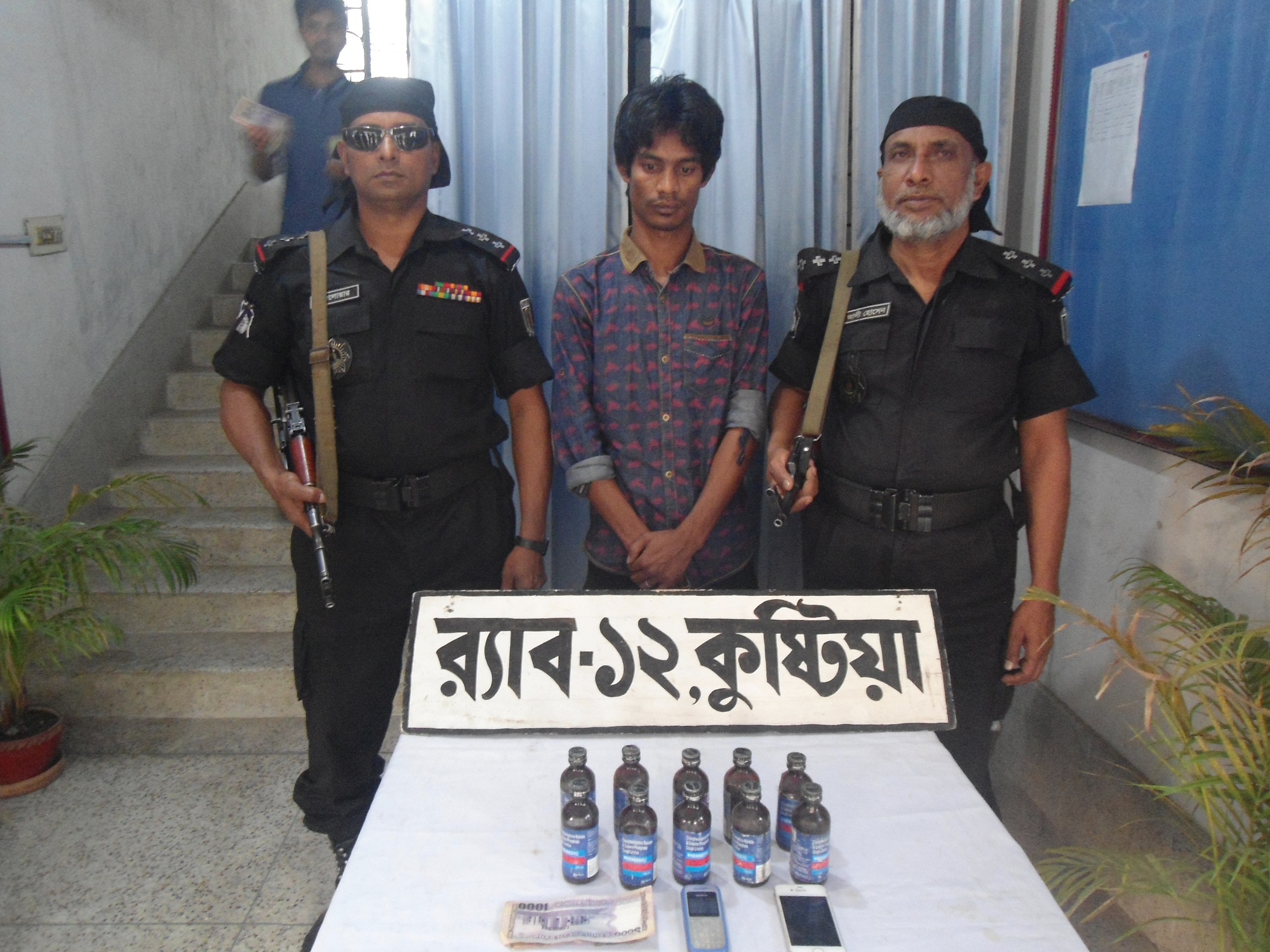 নুরুন্নবী বাবু : গতকাল গোপন সংবাদের ভিত্তিতে র্যাব-১২, সিপিসি-১, কুষ্টিয়া ক্যাম্পের একটি আভিযানিক দল কুষ্টিয়া ত্রিমোহিনী এলাকায় অভিযান চালিয়ে করে মিলন খাঁ(২৫), পিতা-মৃত ইসমাঈল খাঁ, সাং-চারুলিয়া, থানা-মিরপুর, জেলা-কুষ্টিয়াকে ১০ বোতল ফেনসিডিল, ফেনসিডিল বিক্রয়ের নগদ ১,০৮৬/- টাকা, ০২ টি মোবাইল সেট ও হৃদয় কুমার শর্মা(২০), পিতা-শ্রী নব কুমার শর্মা, সাং-বারখাদা মিস্ত্রীপাড়া, থানা ও জেলা-কুষ্টিয়াকে ১৯ বোতল ফেনসিডিলসহ আটক করে। ধৃত মিলন খাঁ ও হৃদয় কুমার শর্মা দীর্ঘদিন যাবৎ আমদানী নিষিদ্ধ ভারতীয় ফেনসিডিলের অবৈধভাবে ব্যবসা করছিল। উদ্ধারকৃত আলামত ও আসামীদের বিরুদ্ধে কুষ্টিয়া সদর থানায় পৃথক মামলা দায়ের পূর্বক হস্তান্তর করার বিষয়টি প্রক্রিয়াধীন আছে।