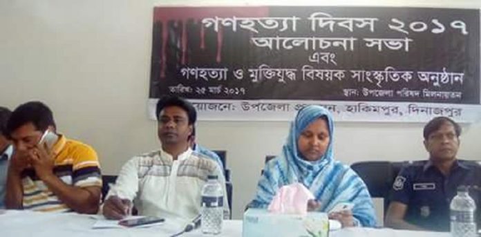 মোঃরাজন আলী,হিলি সংবাদদাতাঃ দিনাজপুরের হাকিমপুর উপজেলা প্রশাসনের উদ্যোগে গণহত্যা দিবস পালন করা হয়েছে। দিবসটি পালনে শনিবার বেলা ১০ টায় উপজেলা পরিষদ হলরুমে নির্বাহী অফিসার শুকরিয়া পরভীনের সভাপতিত্বে আলোচনা সভায় বক্তব্য রাখেন, হাকিমপুর উপজেলা আওয়ামী লীগের সিনিয়র সহ-সভাপতি অধ্যাপক আব্দুস সাত্তার মন্ডল, সাংগঠনিক সম্পাদক সোহরাব হোসেন মল্লিক, পৌর মেয়র জামিল হোসেনসহ বিভিন্ন শিক্ষা প্রতিষ্ঠানের শিক্ষার্থীরা।