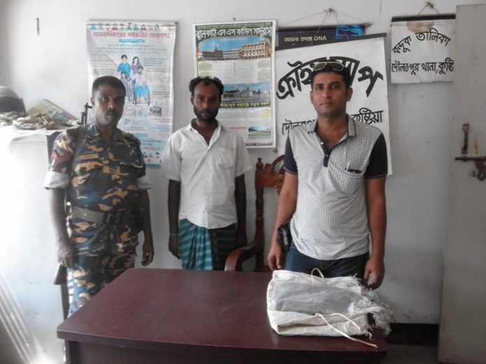 রনি অাহমেদঃ কুষ্টিয়ার দৌলতপুরে ৫০০ গ্রাম গাঁজাসহ মফিদুল (৩৫) নামে এক মাদক ব্যাবসায়ী কে গ্রেফতার করেছে পুলিশ।গ্রেফতারকৃত মফিদুল উপজেলার প্রাগপুর ইউনিয়নের মিরের পাড়া গ্রামে মৃত তেতুল মণ্ডলের ছেলে।পুলিশ ও প্রত্যক্ষদর্শিরা জানায় বুধবার সকাল সাড়ে ১০ টার দিকে গোপন সংবাদের ভিত্তিতে মথুরাপুর পুলিশ ক্যাম্পের ইনচার্জ এ এস আই মিহির কুমার মজুমদার সংগীয় ফোর্স নিয়ে উপজেলার প্রাগপুর ইউনিয়নের ডাংমড়কা বাজার এলাকা থেকে ৫০০ গ্রাম গাঁজাসহ তাকে গ্রেফতার করে।এব্যপারে দৌলতপুর থানার ভারপ্রাপ্ত কর্মকর্তা তদন্ত মোঃ অাজগার হোসেন সাংবাদিকদের জানান মফিদুল দীর্ঘদিন ধরে মাদক ব্যাবসা করে এবং তার নামে দৌলতপুর থানায় মাদকের একটি মামলা হয়েছে।