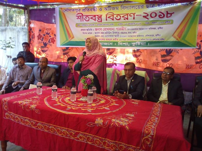 দৌলতপুর প্রতিনিধিঃ কুষ্টিয়ার দৌলতপুর থানার প্রতিবন্ত্রী অটিজম বিদ্যালয়ে বৃহস্প্রতিবার বেলা ১১টায় দুস্থ ও প্রতিবন্ধী শিক্ষার্থীদের মাঝে দিশা সংস্থার উদ্যোগে প্রায় দেড়শতাধীক শীত বস্ত্র কম্বল বিতরণ করেন। প্রধান অতিথি থেকে বিতরণ করেন সমাজ সেবা অধিদপ্তরের কুষ্টিয়ার উপ পরিচালক রোখসানা পারভীন। এ উপলক্ষে শীত বস্ত্র বিতরণ অনুষ্ঠানে প্রতিবন্ধী অটিজম বিদ্যালয়ের প্রধান শিক্ষক আবু সালেহ মজনুল কবির পান্নার সভা পতিত্বে আয়োজিত অনুষ্ঠানে প্রধান অতিথির বক্তব্য রাখেন সমাজ সেবা অধিদপ্তরের উপ পরিচালক রোখসানা পারভীন, বিশেষ অতিথির বক্তব্য রাখেন দিশার পরিচালক রবিউল ইসলাম, সাংবাদিক মোঃ সাইফুল ইসলাম শাহীন, সমাজ সেবা কর্মকর্তা সানোয়ার আলী মাসুদ রানা বিশিষ্ট সমাজ সেবক জামিরুল ইসলাম খান।
