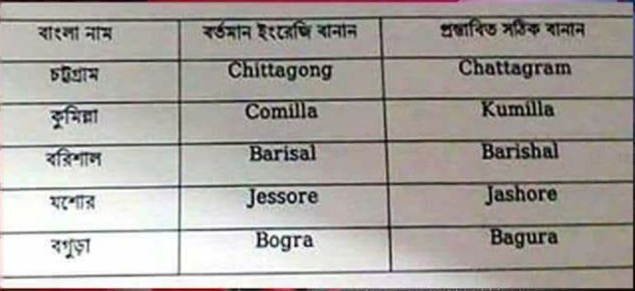 মন্ত্রিপরিষদ বিভাগ থেকে জানা গেছে, Chittagong এর পরিবর্তে বানান Chattagram, Comilla এর পরিবর্তে Kumilla, Barisal এর পরিবর্তে Barishal, Jessore এর পরিবর্তে Jashore এবং Bogra এর পরিবর্তে Bogura করার প্রস্তাব অনুমোদনের জন্য নিকার সভায় উঠছে।