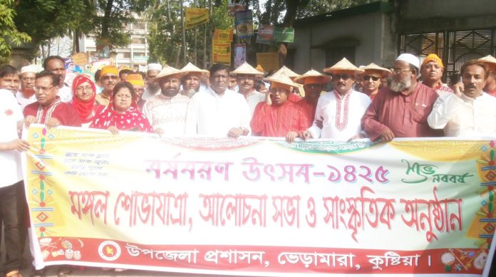এস.এম.আবু ওবাইদা-আল-মাহাদী ॥ প্রতি বছরের ন্যায় জাকজমক পূর্ণ আয়োজনের মধ্য দিয়ে বাঙ্গালী জাতির ঐতিহ্যবাহী উৎসব পহেলা বৈশাখ কুষ্টিয়ার ভেড়ামারা উপজেলা প্রশাসনের উদ্যোগে উদযাপন করা হয়েছে। বাঙালির প্রাণের উৎসব পহেলা বৈশাখে ১৪২৪ পুরনো বছরকে বিদায় জানিয়ে নতুন ১৪২৫ বরণ করে নিতে ভেড়ামারায় অনুষ্ঠিত হয়েছে বর্ষবরণ উৎসব-১৪২৫। ভেড়ামারা উপজেলা প্রশাসন ও বৈশাখী উদযাপন কমিটির যৌথ উদ্যোগে গত ১৪ই এপ্রিল শনিবার সকাল ৯টায় উপজেলা চত্ত্বর থেকে মঙ্গল শোভাযাত্রা বের হয়। মঙ্গল শোভাযাত্রাটির নেতৃত্ব দেন ভেড়ামারা উপজেলা নির্বাহী অফিসার মোঃ সোহেল মারুফ। এসময় ভেড়ামারা উপজেলা চেয়ারম্যান এ্যাডঃ তৌহিদুল ইসলাম আলম, ভেড়ামারা উপজেলা আওয়ামীলীগের সভাপতি আলহাজ্ব আক্তারুজ্জামান মিঠু, কেন্দ্রীয় জাসদের সাংগঠনিক সম্পাদক আলহাজ্ব আব্দুল আলীম স্বপন, পৌর মেয়র আলহাজ্ব শামিমুল ইসলাম ছানা, ভেড়ামারা উপজেলা ভাইস চেয়ারম্যান আমিরুল ইসলাম, মোকারিমপুর ইউপি চেয়ারম্যান মোঃ আব্দুস সামাদ, বাহাদুরপুর ইউপি চেয়ারম্যান আশিকুর রহমান ছবি, ধরমপুর ইউপি চেয়ারম্যান শাহাবুল ইসলাম লালু ও জুনিয়াদহ ইউপি চেয়ারম্যান শাহেদ আহম্মেদ শওকত উপস্থিত ছিলেন। মঙ্গল শোভাযাত্রা শেষে উপজেলা চত্বরে আলোচনা সভা ও সাংস্কৃতিক অনুষ্ঠানের আয়োজন করে ভেড়ামারা উপজেলা প্রশাসন।