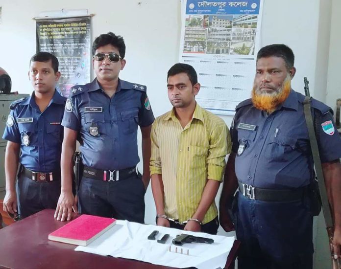 দৌলতপুর (কুষ্টিয়া) প্রতিনিধি : কুষ্টিয়ার দৌলতপুর উপজেলার বাহির মাদিয়া এলাকা থেকে পিস্তল গুলি ও ম্যাগজিন সহ অস্ত্র ব্যবসায়ীকে আটক করেছে পুলিশ। পুলিশ জানায় ৩০ জুলাই সোমবার গোপন সংবাদের ভিত্তিতে অভিযান চালিয়ে একটি নাইন এমএম পিস্তুল, ৪ রাউন্ড গুলি ও দুইটা ম্যাগজিন সহ এক অস্ত্র ব্যবসায়ীকে আটক করেছে। গত ৩০ জুলাই সোমবার রাত ৯ টার দিকে উপজেলার ফিলিপনগর ইউপি’র বাহিরমাদী সদর ঘাট গ্রামের মকবুল সর্দারের ছেলে লিটন (৩৮), বাবুর ছেলে রাসেল(৩২) ও পান্নুর ছেলে মতিন(৩০), তিন জন একটি মটর সাইকেল যোগে অস্ত্র, গুলি নিয়ে হোসেনাবাদ বাজারে বিক্রির উদ্দ্যোশে যাওয়ার পথে, আসমত নেতার বাড়ীর সামনে পৌঁছালে দৌলতপুর থানার এস.আই সাইফুল ইসলাম ও এ.এস.আই কামরুল সঙ্গীয় ফোর্স নিয়ে তাদের মটর সাইকেলের গতি রোধ করে সামনে দাঁড়ালে, রাসেল ও মতিন দৌঁড়ে পালিয়ে গেলে, লিটন কে হাতে নাতে অস্ত্র সহ গ্রেপ্তার করে। এই ঘটনায় দৌলতপুর থানায় অস্ত্র আইনে মামলা দায়ের করা হয়েছে। যাহার মামলা নম্বর ৪৪, তাং৩০/৭/১৮।