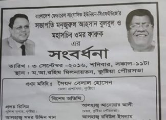 সাংবাদিক ইউনিয়ন কুষ্টিয়ার আয়োজনে বাংলাদেশ ফেডারেল সাংবাদিক ইউনিয়ন বিএফইউজে ' র সভাপতি মনজুরুল আহসান বুলবুল ও মহাসচিব ওমর ফারুক কে সংবর্ধনা ৷